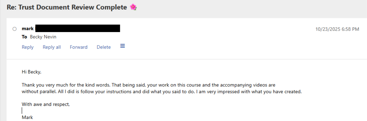 By enrolling, you agree that neither Becky Nevin nor Titan Trust shall be held liable for any direct, indirect or incidental damages arising from your use of the information or services provided. You assume full responsibility for your decisions, filings and results.